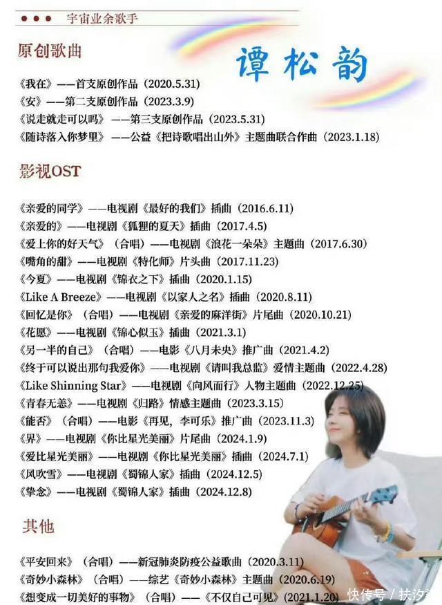 八年间,谭松韵为20余部的热门影视剧演唱了OST,从《锦衣之下》中甜度爆表的《今夏》,到热播剧《归路》里温柔治愈的《青春无恙》,再到《最好的我们》中充满青春气息的插曲,每一首都精准贴合剧情情绪,成为剧迷心中的“白月光”。 这些OST不仅为影视剧增色,更凭借优质的旋律和细腻的唱腔,在音乐平台收获大量播放量,不少非剧迷也被她的歌声圈粉。